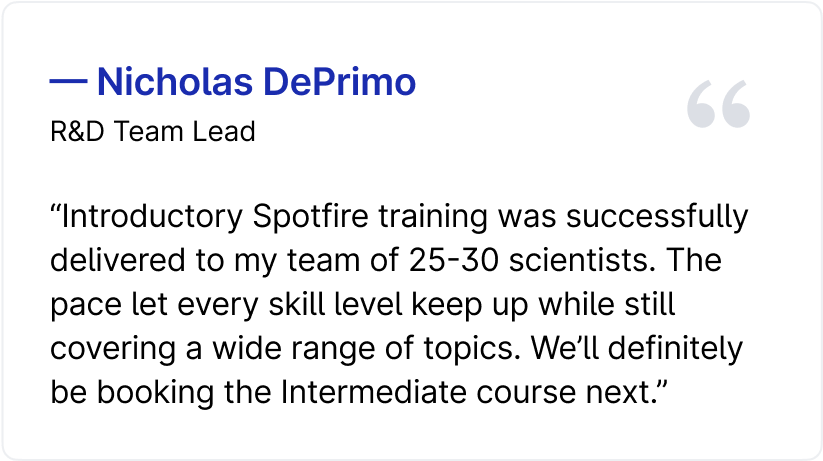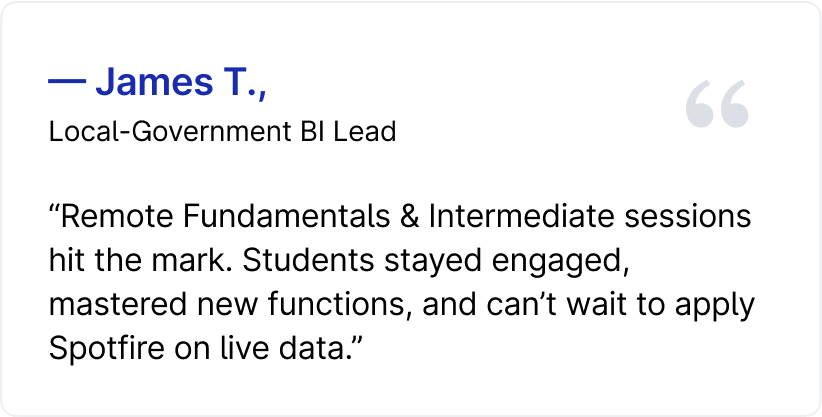 Level-up analysts, BI leads, power-users, and admins with our proven five-course interactive dashboard training program—rated 5.0 across energy, government, and life sciences. Each intensive, instructor-led Spotfire course is 100% hands-on, guiding your team from core analytics to real-world dashboard automation.